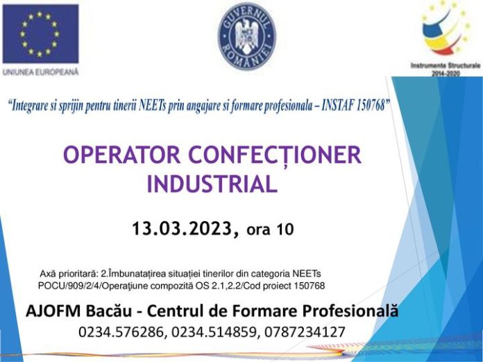 Daca ai intre 16 si 30 de ani, nu ai un loc de munca, nu urmezi o forma de invatamant, ai domiciliul in judetul Bacau si doresti sa obtii o calificare in domeniul confectiilor si poate chiar sa te angajezi, vino sa te inscrii la cursul de calificare gratuit organizat prin proiectul european INSTAF !